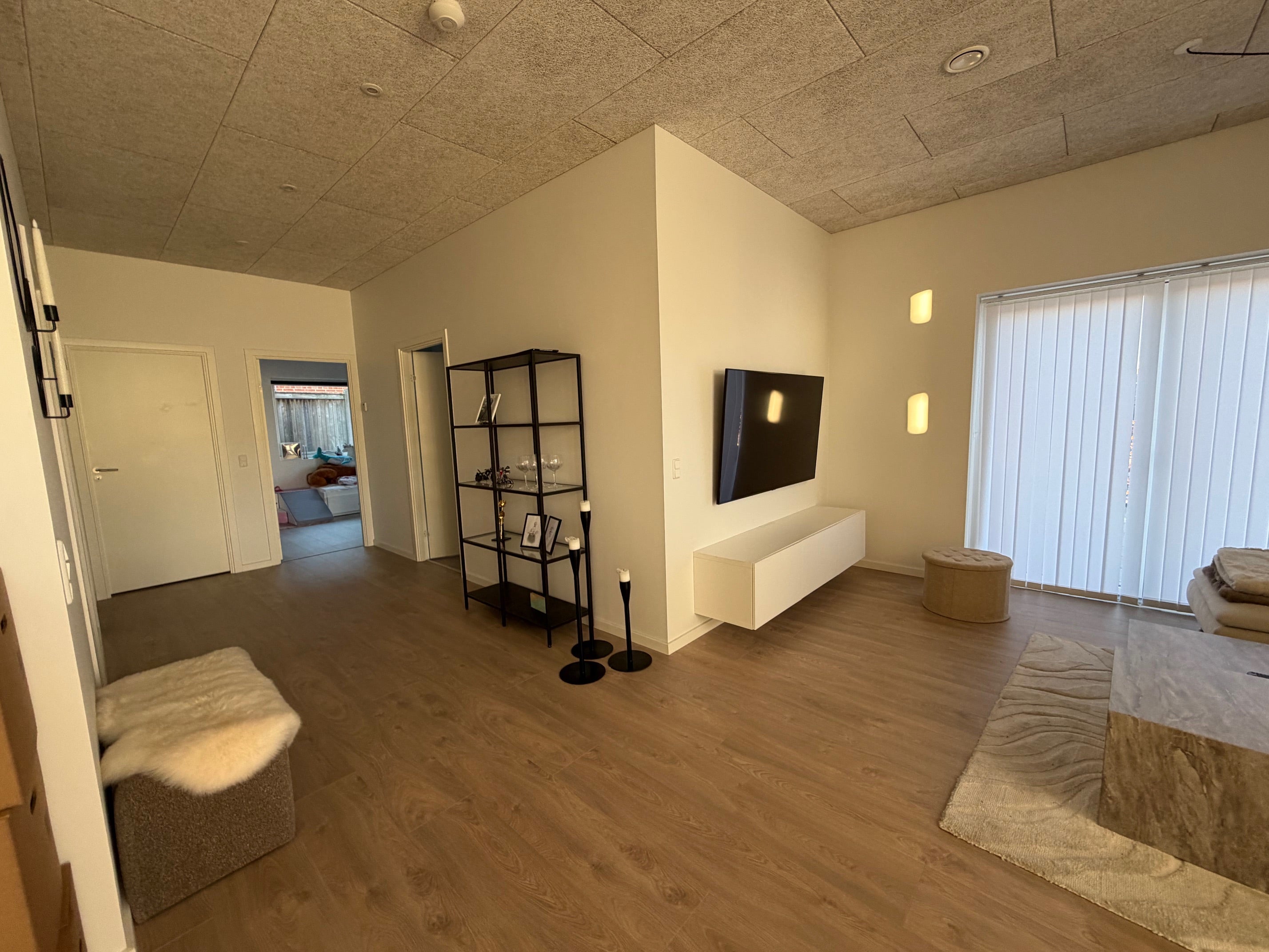 Indvendigt byder den velindrettede bolig på entré med masser af skabsplads, en hyggelig stue samt et moderne køkken/alrum med alt i indbygningshvidevarer – inkl. opvaskemaskine. Herudover er der tre rummelige værelser - alle med skabe, et stilfuldt badeværelse samt et praktisk depot/ teknikrum med forberedelse for vaskesøjle. Alt inventar er fra Designa i et smukt moderne tidløst design.