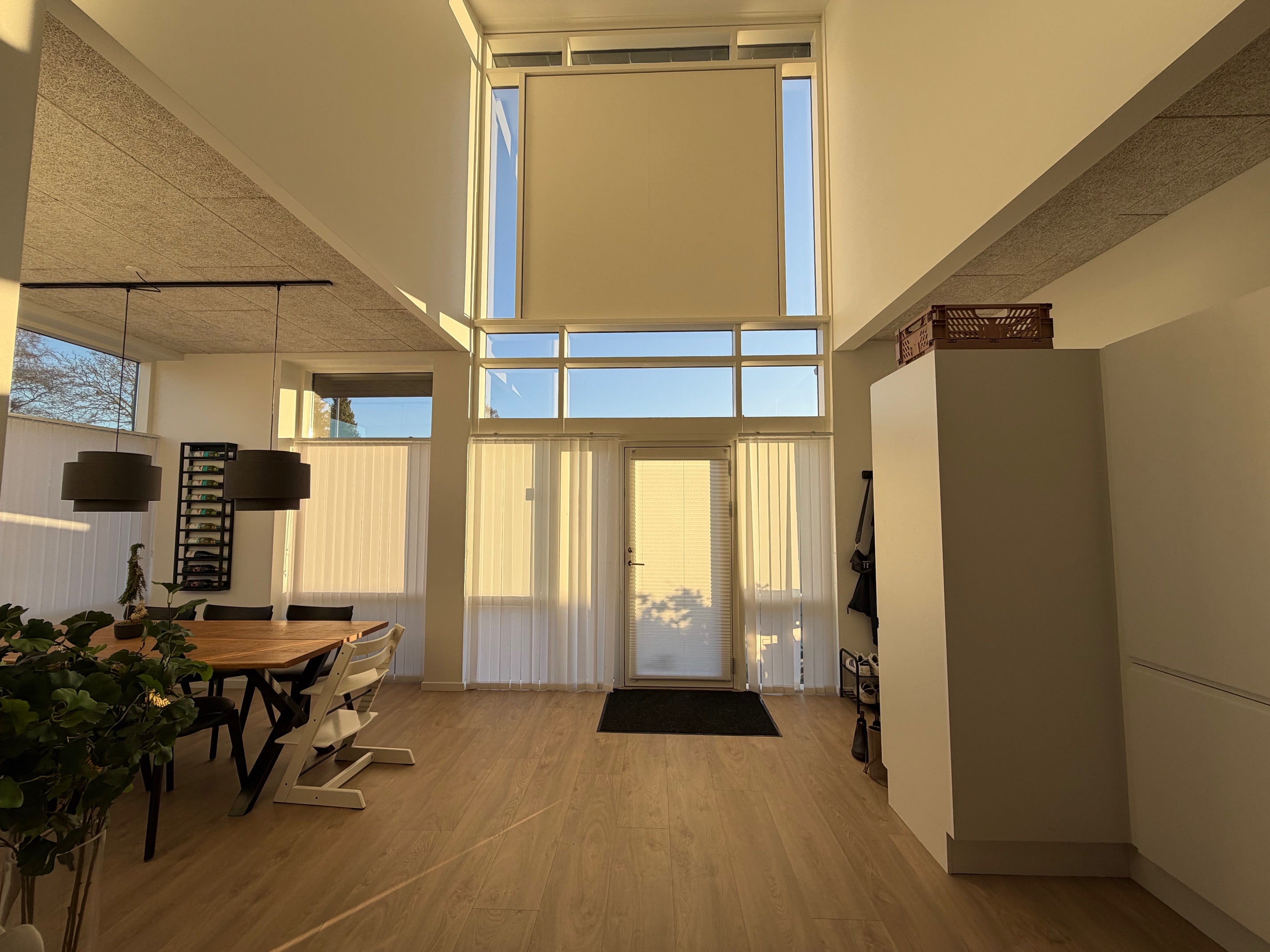 Gulvvarme i alle rum sikrer behagelige temperaturer året rundt, mens troltektlofterne bidrager til god akustik og en behagelig atmosfære i boligen.