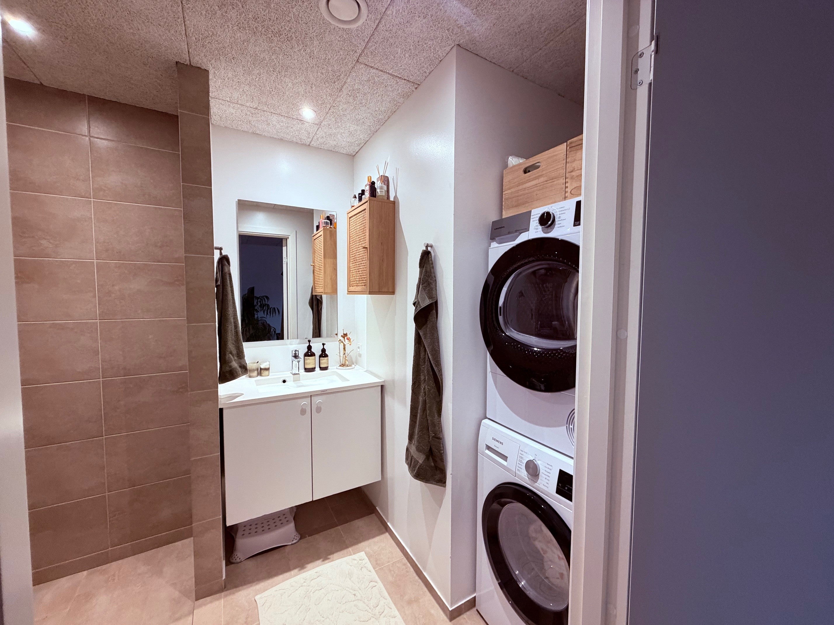 Lejligheden er indrettet med entre med skabe samt stue/alrum med inventar fra Invita samt alt i indbygningshvidevarer – inkl. opvaskemaskine. Herudover 2 store soverum med skabe, teknikrum samt lækkert badeværelse med gulvvarme, Invita-skabe og forberedelse for vaskesøjle. Endelig er der et rummeligt depotrum i selve lejligheden.