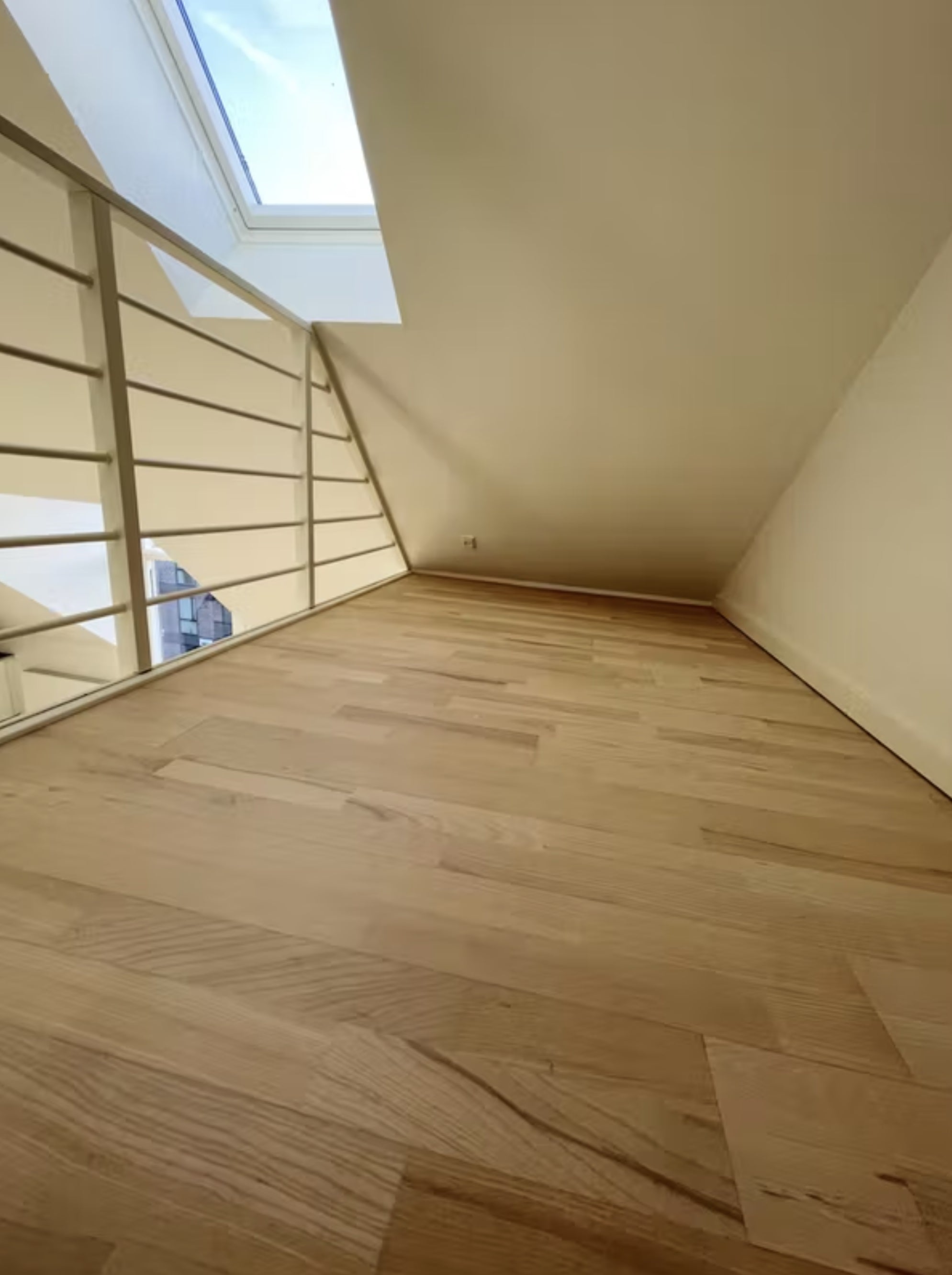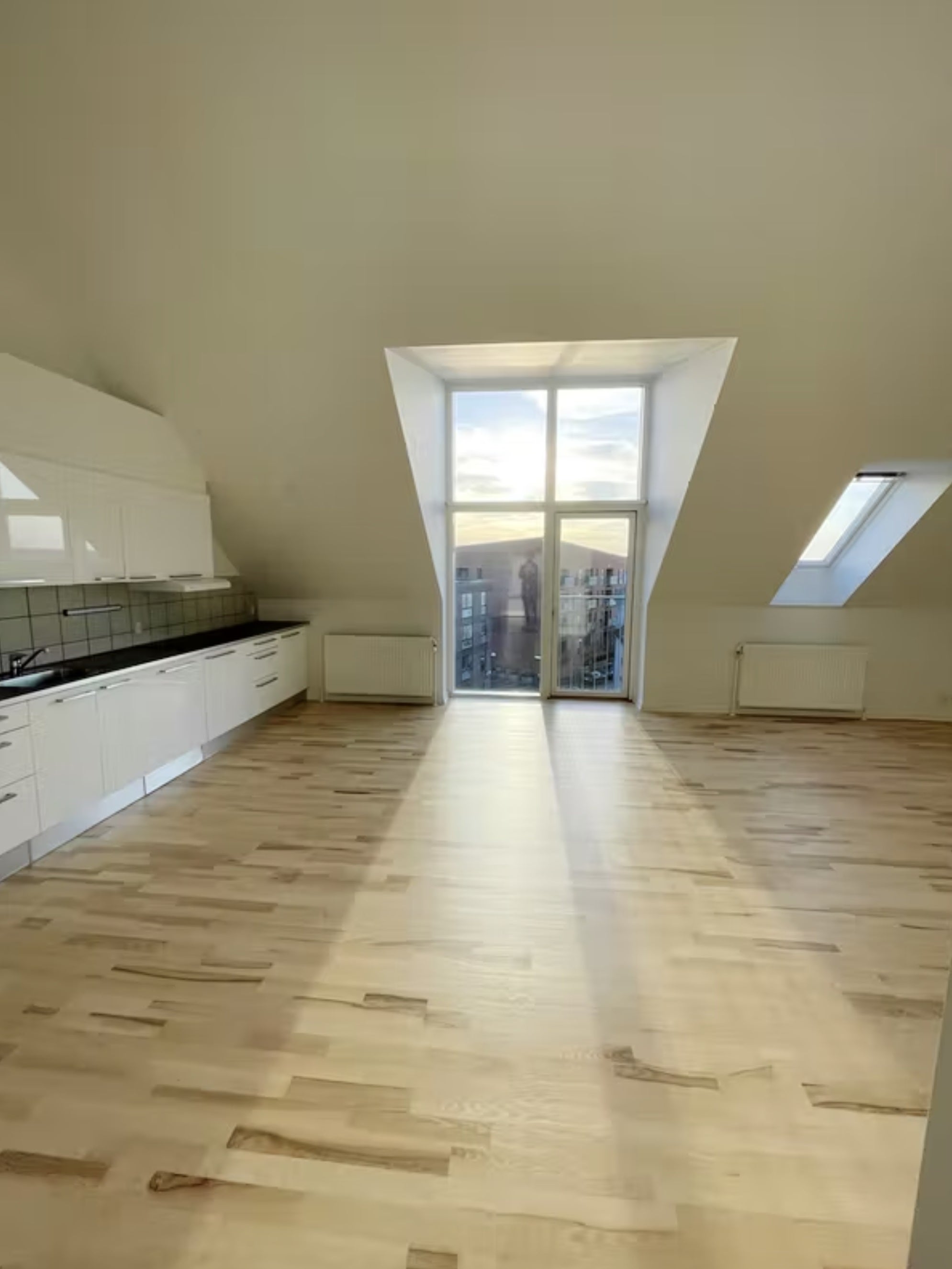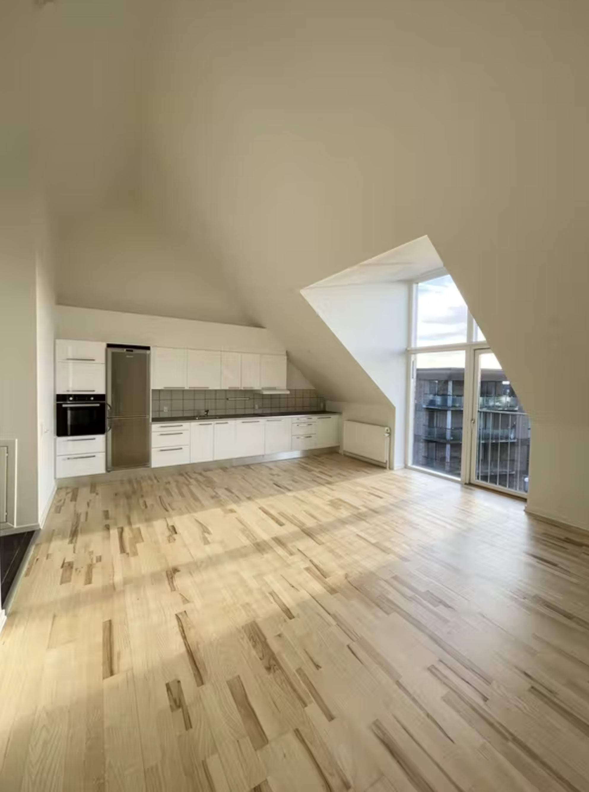 Lejligheden består af et stort køkkenalrum/stue med hems som fungerer godt som kontorområde. Lejlighedens køkken byder på en moderne indretning med masser af skabsplads samt opvaskemaskine