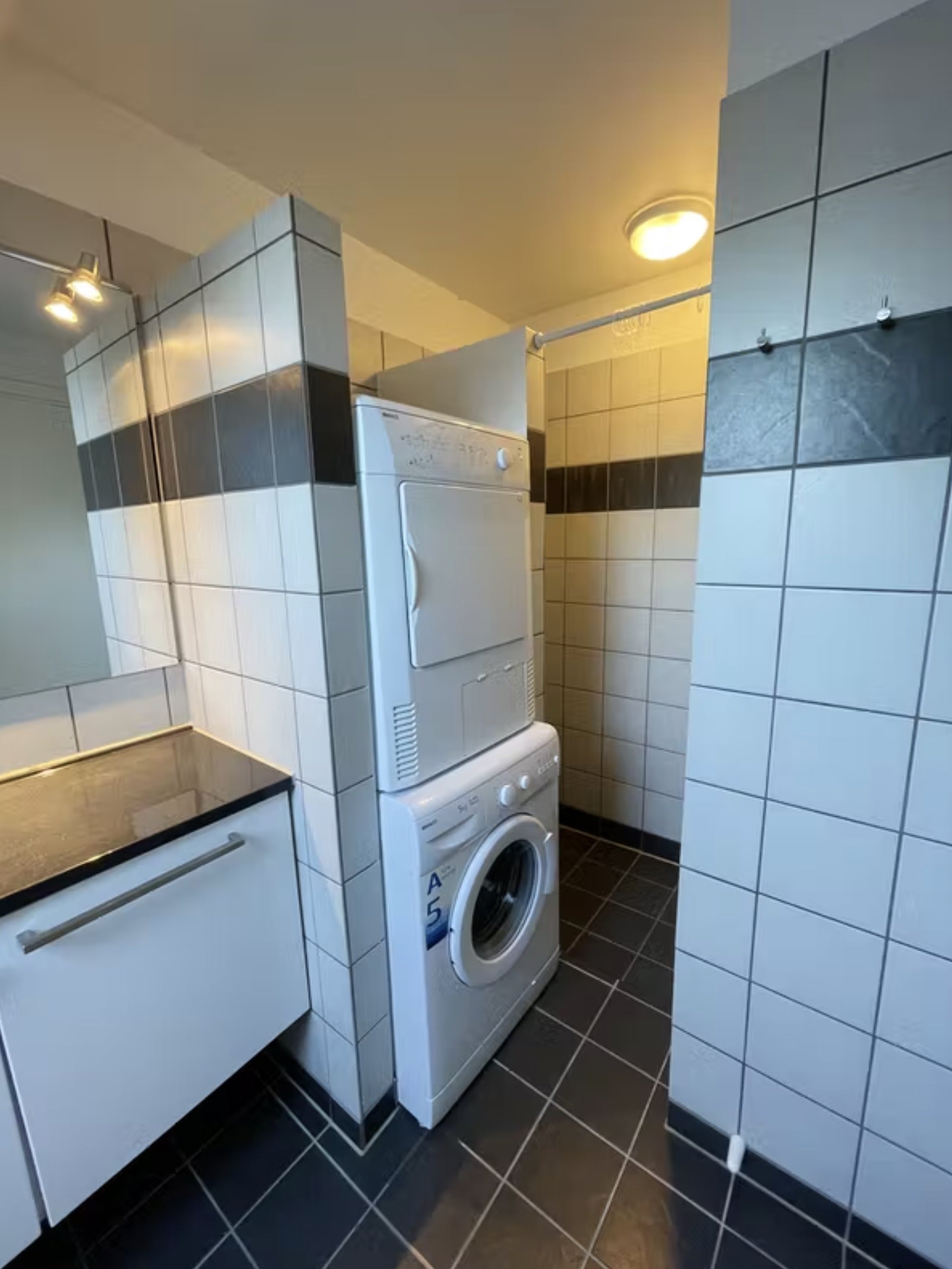 Lejligheden har et stort nyere badeværelse med indbygningsskabe samt egen vaskemaskine og tørretumbler