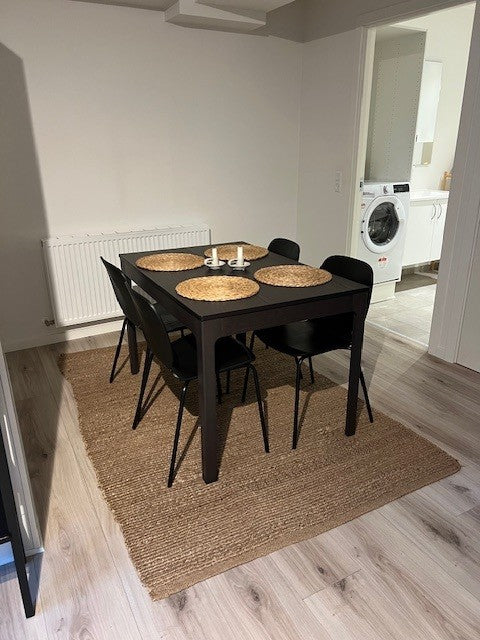 Lejligheden er i stueplan indrettet med entre med skabe, lækkert køkken udstyret med inventar fra Aubo, ligesom der er gode hvidevarer over alt – induktionskogeplade, indbygningsovn, emhætte, indbygnings-køle/fryseskab samt indbygningsopvaskemaskine. Badeværelset har klinkegulve med gulvvarme, bruseniche med flisevæg, væghængt toilet samt forberedelse til vaskesøjle. Lejligheden er i to etager med trappe fra alrum, der fører til første sal. Her finder man 2 soverum med skabe samt stue. I hele lejligheden er der flotte laminatgulve i eg/plank, samt fuldspartlede hvidmalede vægge.