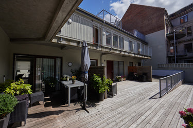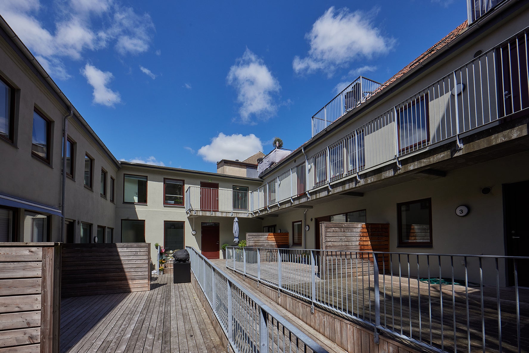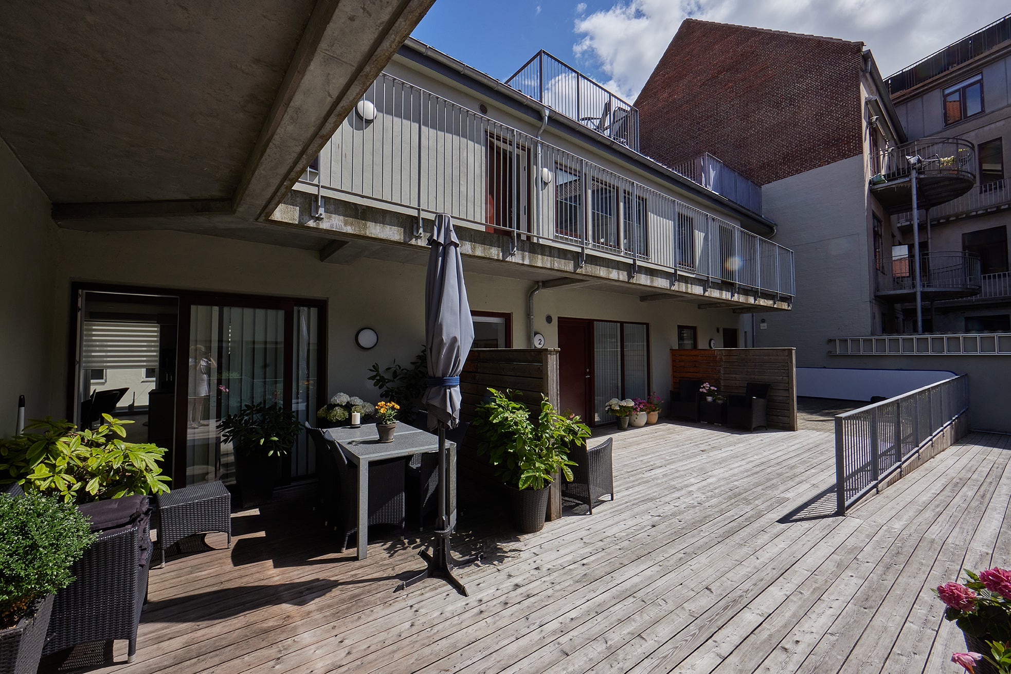 Adgang til lejligheden sker via lækkert gårdmiljø, hvor der til lejligheden hører egen privat gårdhave, hvor der er plads til både havemøbler og grill, hygge og socialt samvær. Derudover følger der store kælderrum med til hver lejlighed samt cykelrum.